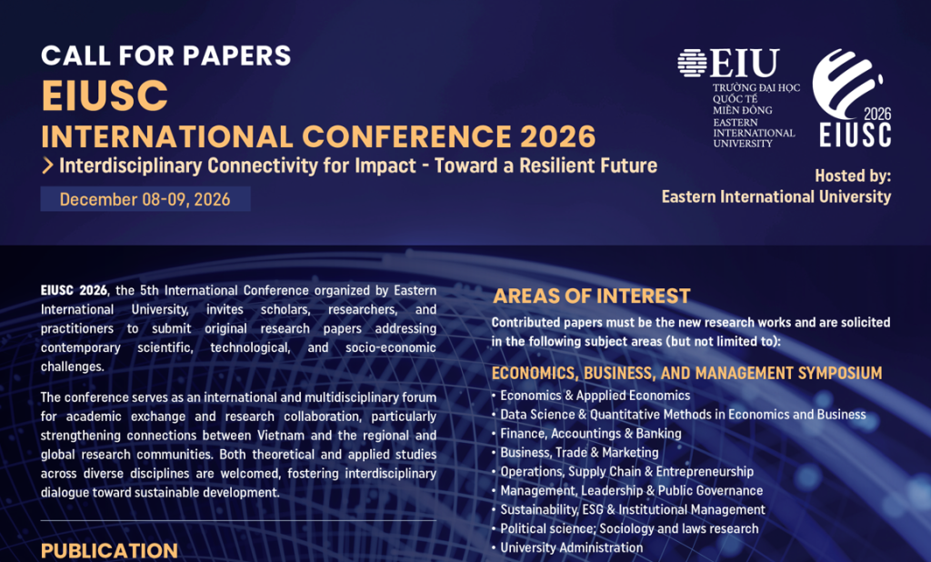 The Organization Committee of the EIUSC International Conference (EIUSC 2026) would like to invite you to participate in the EIUSC 2026. EIUSC is an annual interdisciplinary academic event hosted by Eastern International University. It aims to provide a dynamic forum where experts, researchers, and scholars from diverse fields come together to exchange ideas, present research […]