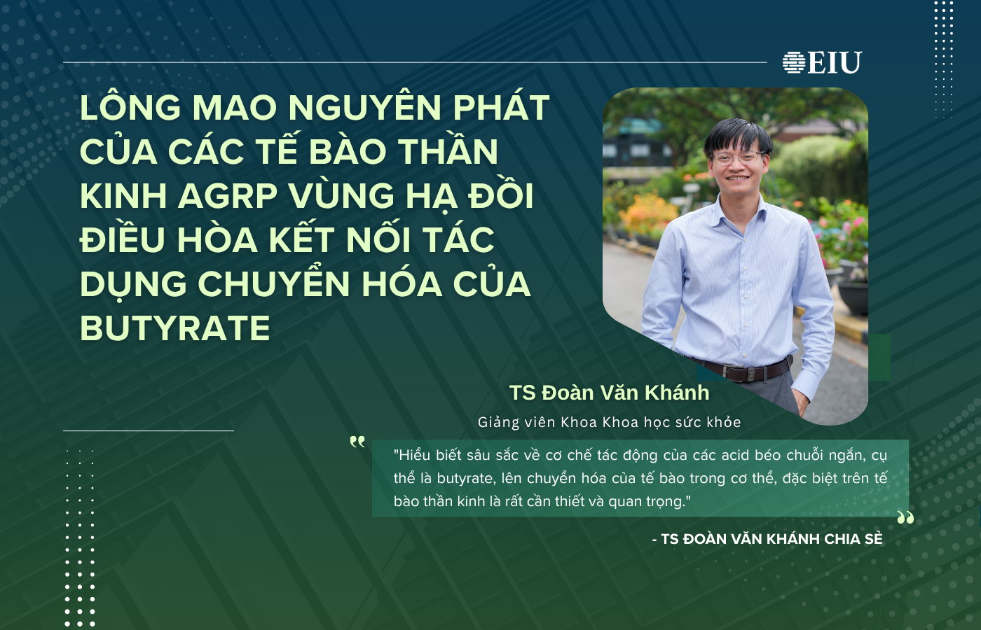 “Butyrate, một sản phẩm chuyển hóa từ chất xơ trong thức ăn bởi vi khuẩn đường ruột, có thể đi vào não và trực tiếp điều hòa cảm giác thèm ăn – một phát hiện mới mở rộng sự hiểu biết về kết nối trục ruột – não”. Đây là phát hiện từ một đề tài nghiên cứu vừa được công bố trên tạp chí Nature Communications do nhóm tác giả, trong đó có TS. Đoàn Văn Khánh hiện đang công tác tại Khoa Khoa học Sức khỏe – Trường Đại học Quốc tế Miền Đông (EIU), là một trong bốn tác giả chính.