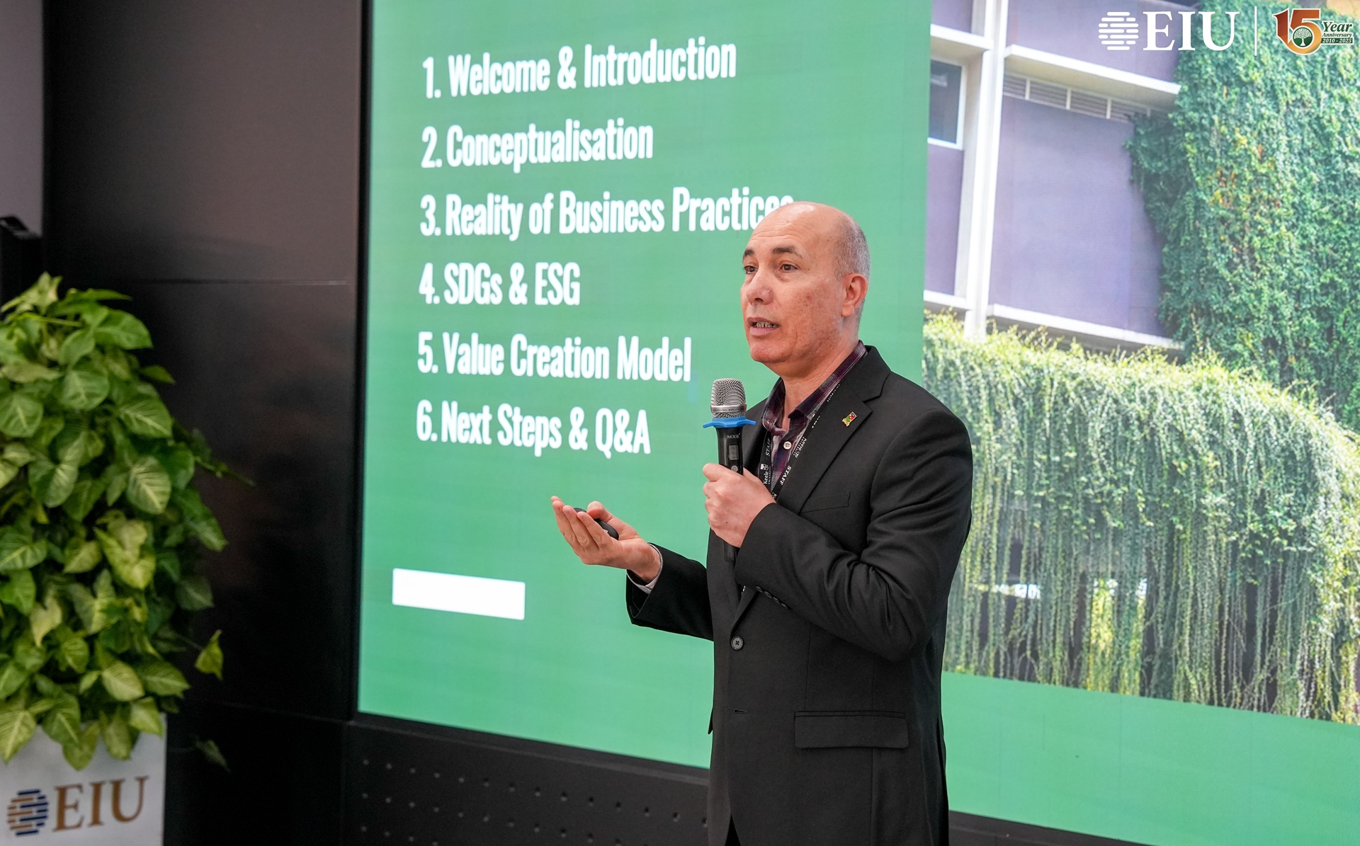Với chủ đề “From Vision to Impact: Building Vietnam’s Sustainability Leaders”, chương trình nhấn mạnh vai trò của giáo dục đại học nói chung và EIU nói riêng trong việc đồng hành cùng doanh nghiệp xây dựng và triển khai các chiến lược phát triển bền vững, hài hòa giữa tăng trưởng kinh tế, trách nhiệm xã hội và bảo vệ môi trường.