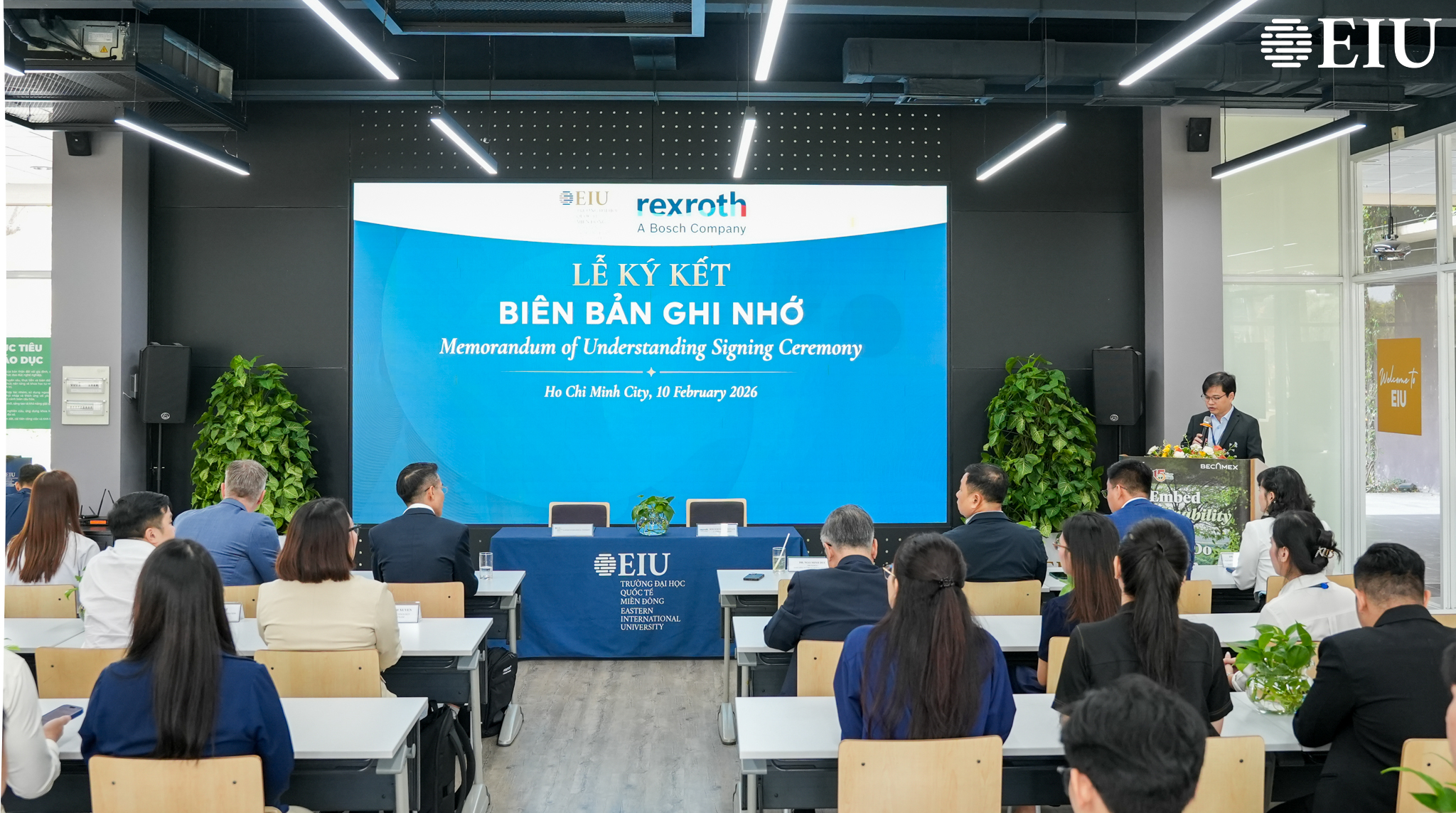 Ngày 10/02, Trường Đại học Quốc tế Miền Đông (EIU) đã tổ chức lễ ký kết Biên bản ghi nhớ hợp tác (MOU) với Bosch Rexroth Vietnam.