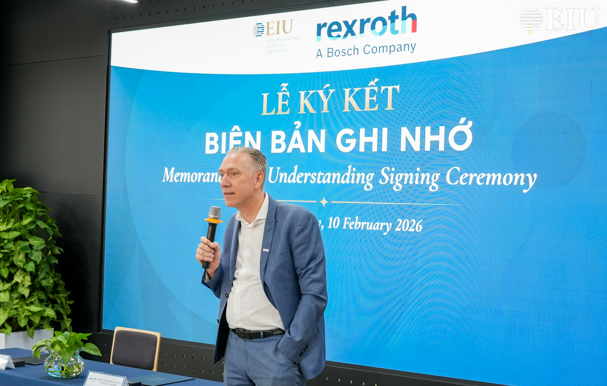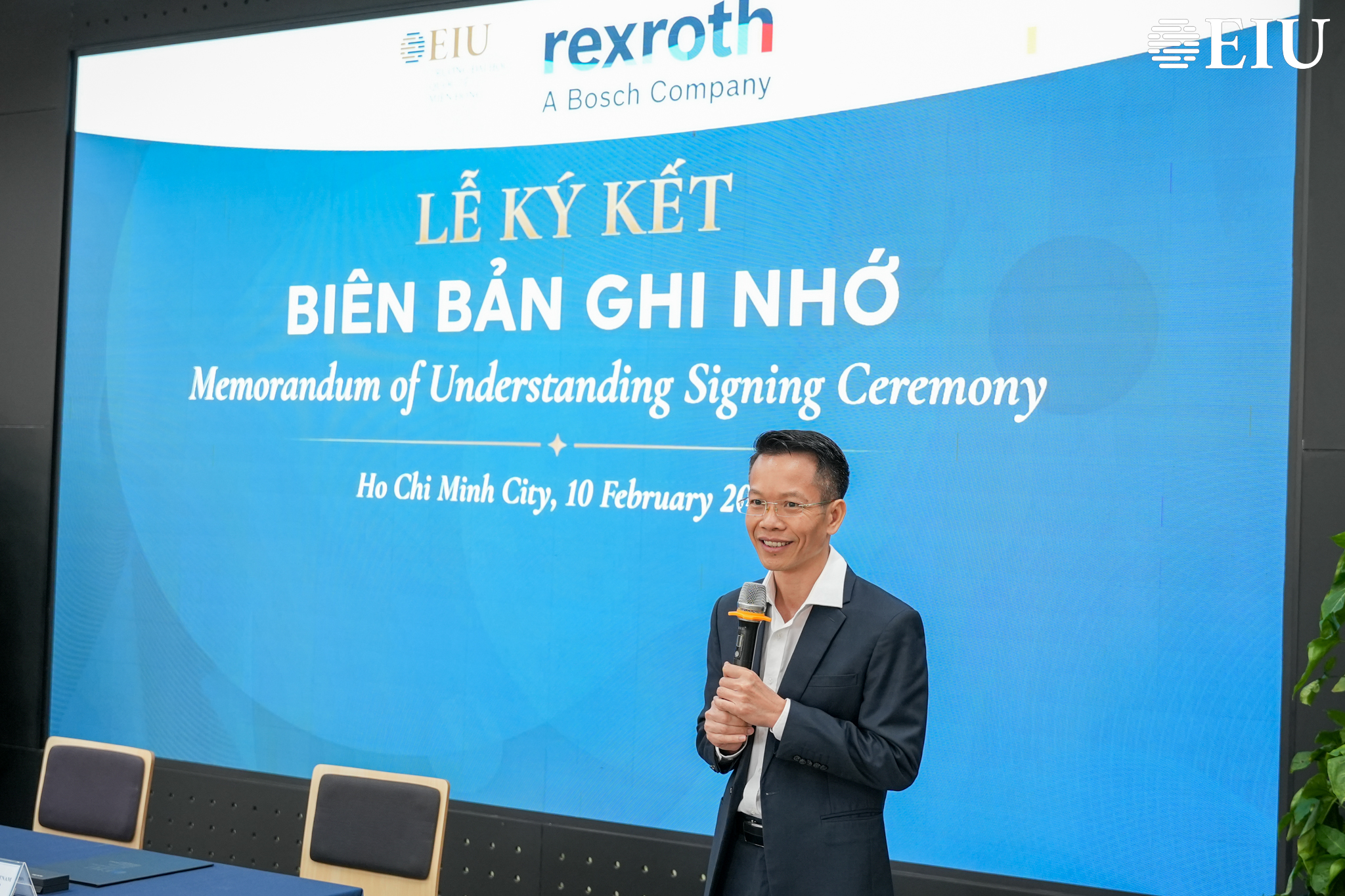 Phát biểu tại chương trình, TS Ngô Minh Đức – Hiệu trưởng EIU cho biết: Lễ ký kết hôm nay đánh dấu sự khởi đầu của mối quan hệ hợp tác ý nghĩa, được xây dựng trên nền tảng tầm nhìn chung, sự tin cậy lẫn nhau và định hướng hợp tác lâu dài. Thông qua Trung tâm Đào tạo Khu vực của Bosch Rexroth tại Singapore và trong quá trình hợp tác phát triển, EIU mong muốn sẽ nghiên cứu, triển khai một mô hình đào tạo hợp tác tương tự tại Tp. Hồ Chí Minh, nhằm góp phần hiện thực hóa mục tiêu phát triển sản xuất thông minh.