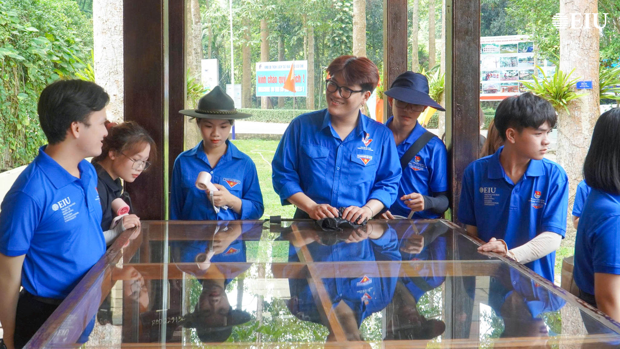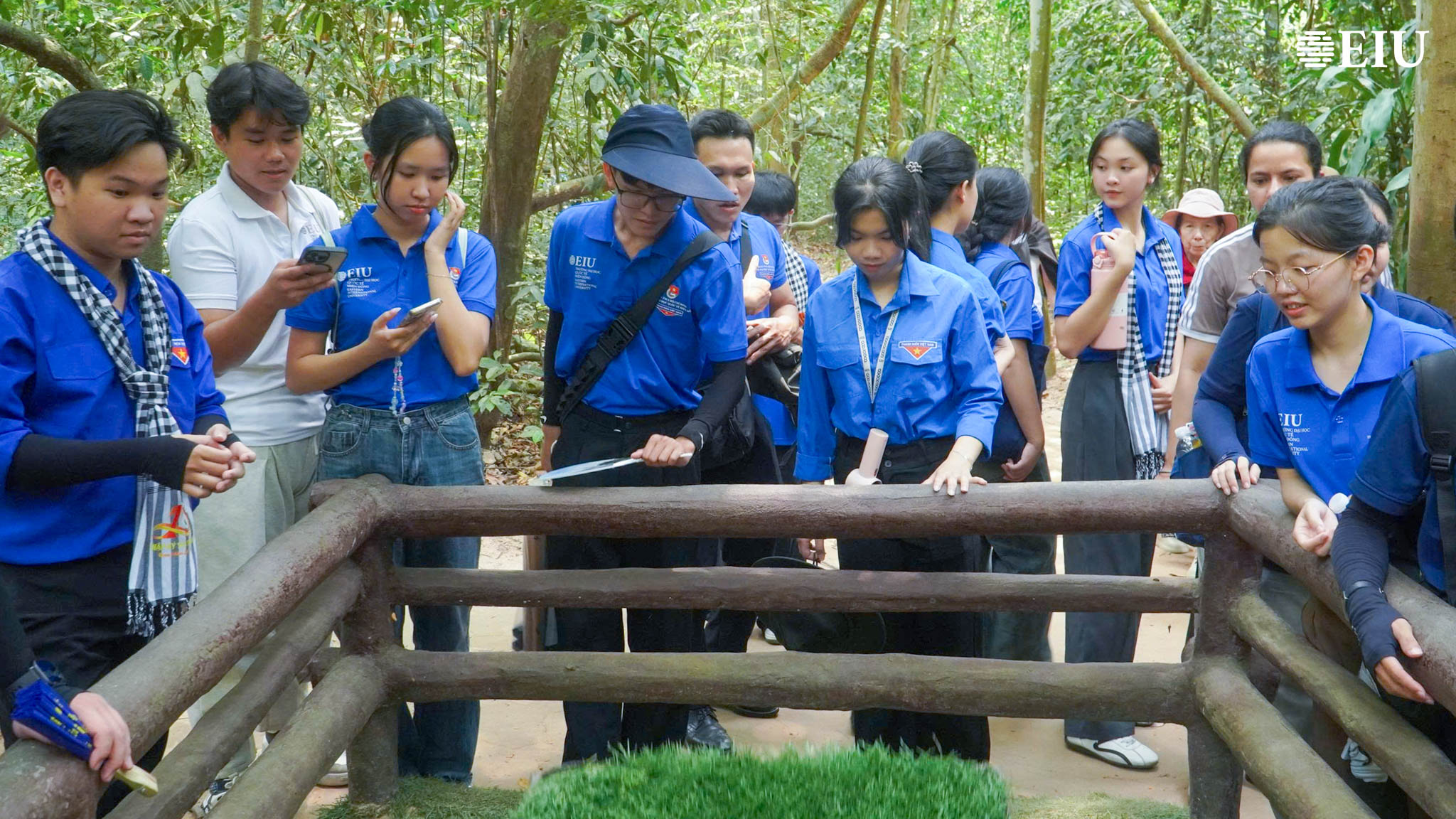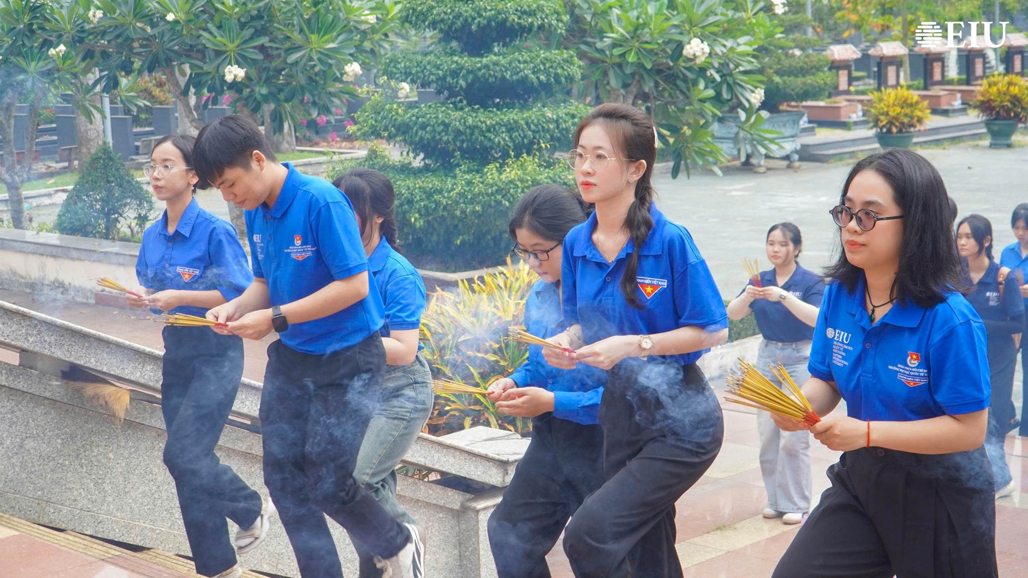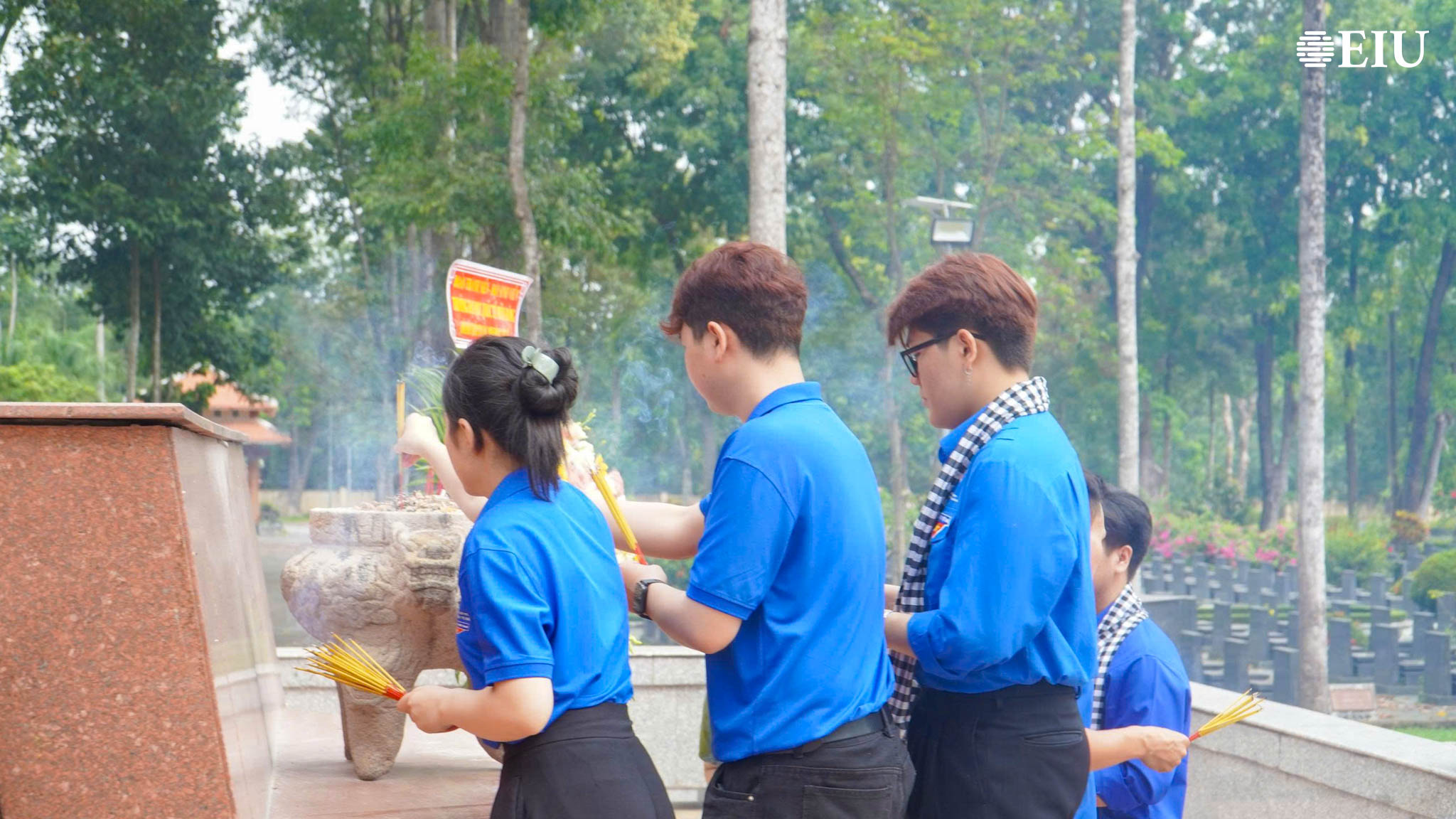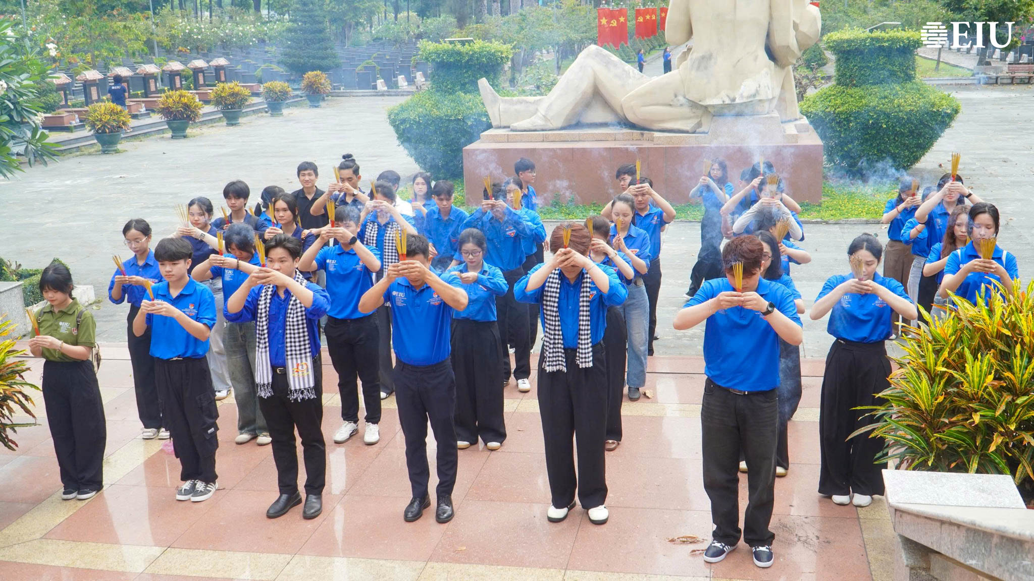 Tại Nghĩa trang Liệt sĩ huyện Củ Chi, trong bầu không khí trang nghiêm, sinh viên EIU đã tổ chức lễ dâng hương, tưởng niệm các anh hùng liệt sĩ. Hoạt động không chỉ thể hiện đạo lý “uống nước nhớ nguồn” mà còn góp phần bồi đắp nhận thức lịch sử, lòng biết ơn đối với các thế hệ đi trước. Tiếp đó, tại Địa đạo Củ Chi, sinh viên đã tham quan, trải nghiệm hệ thống địa đạo, qua hoạt động này, các bạn có cơ hội hiểu rõ hơn về điều kiện sinh hoạt, chiến đấu gian khổ nhưng đầy ý chí kiên cường của quân và dân Việt Nam trong thời chiến.