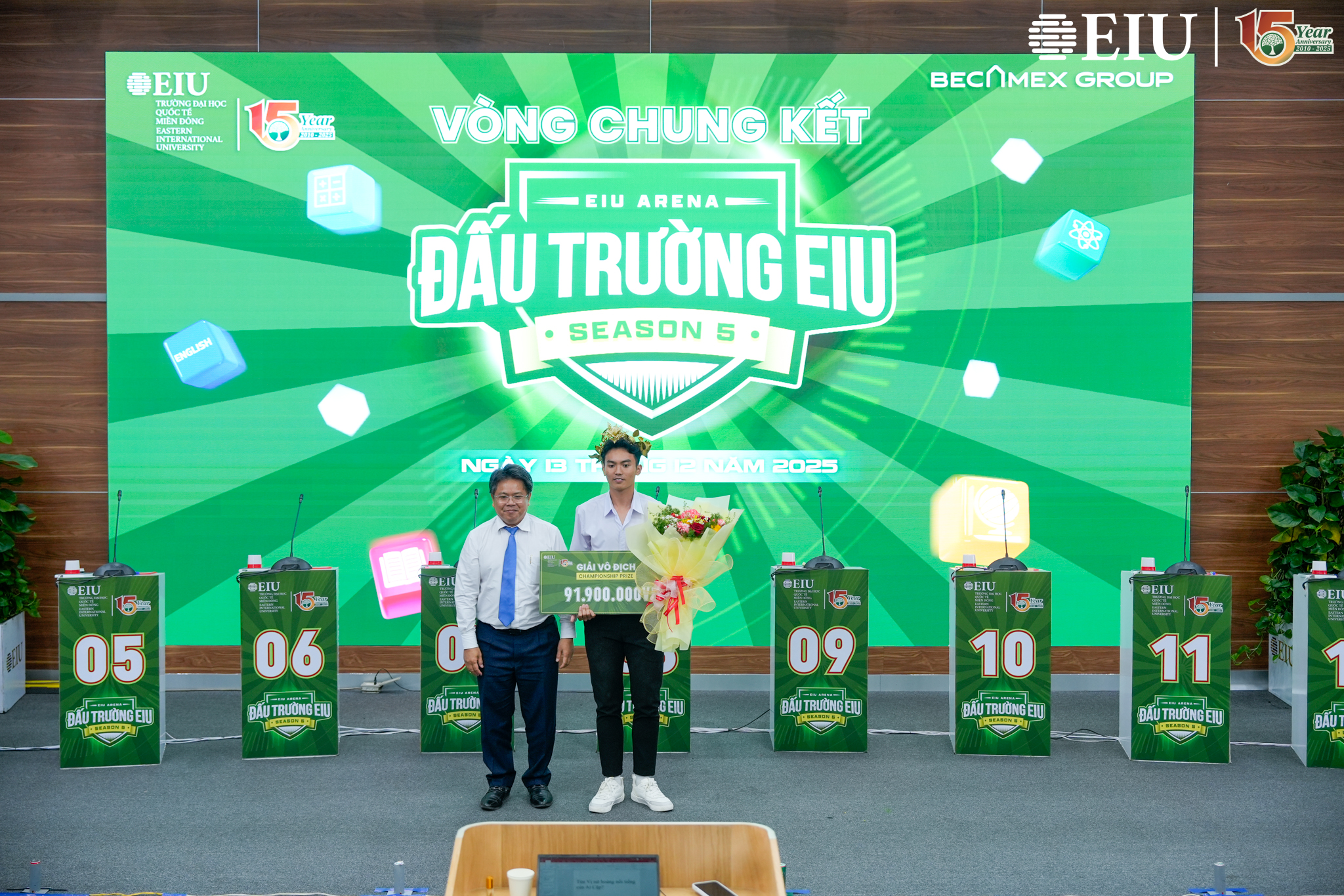 TS Nguyễn Ngọc Huy – Phó Hiệu trưởng EIU trao Quán quân “Đấu trường EIU” mùa 5 cho Trần Đậu Tuấn Thành