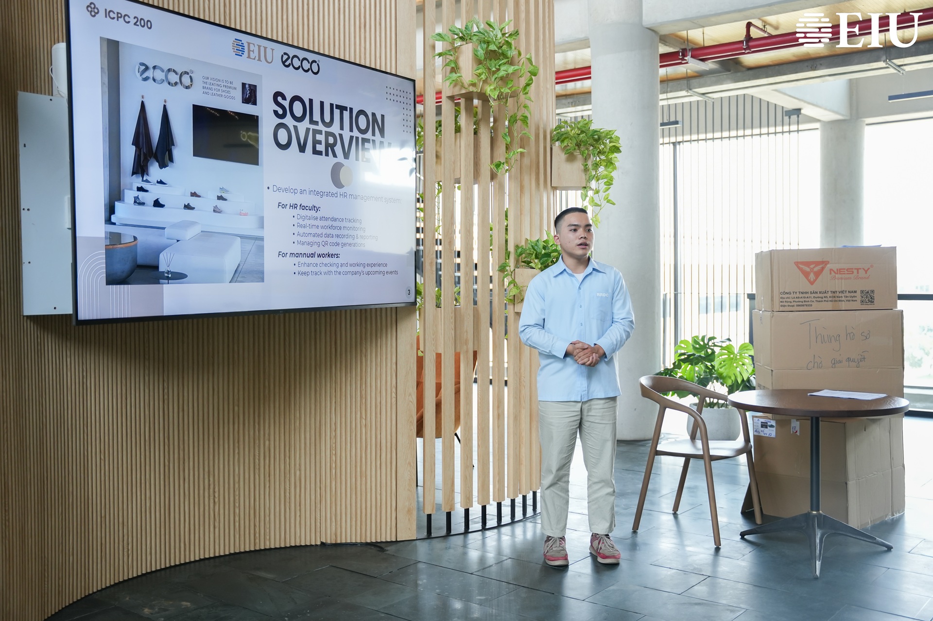 Tại buổi báo cáo cuối kỳ, nhóm sinh viên EIU đã trình bày giải pháp phát triển phần mềm quản trị nhân sự chuyên biệt dành cho nhà máy ECCO. Phần mềm được thiết kế dựa trên đặc thù vận hành và cấu trúc nhân sự thực tế, nhằm tối ưu hóa quy trình quản lý và nâng cao hiệu quả vận hành.