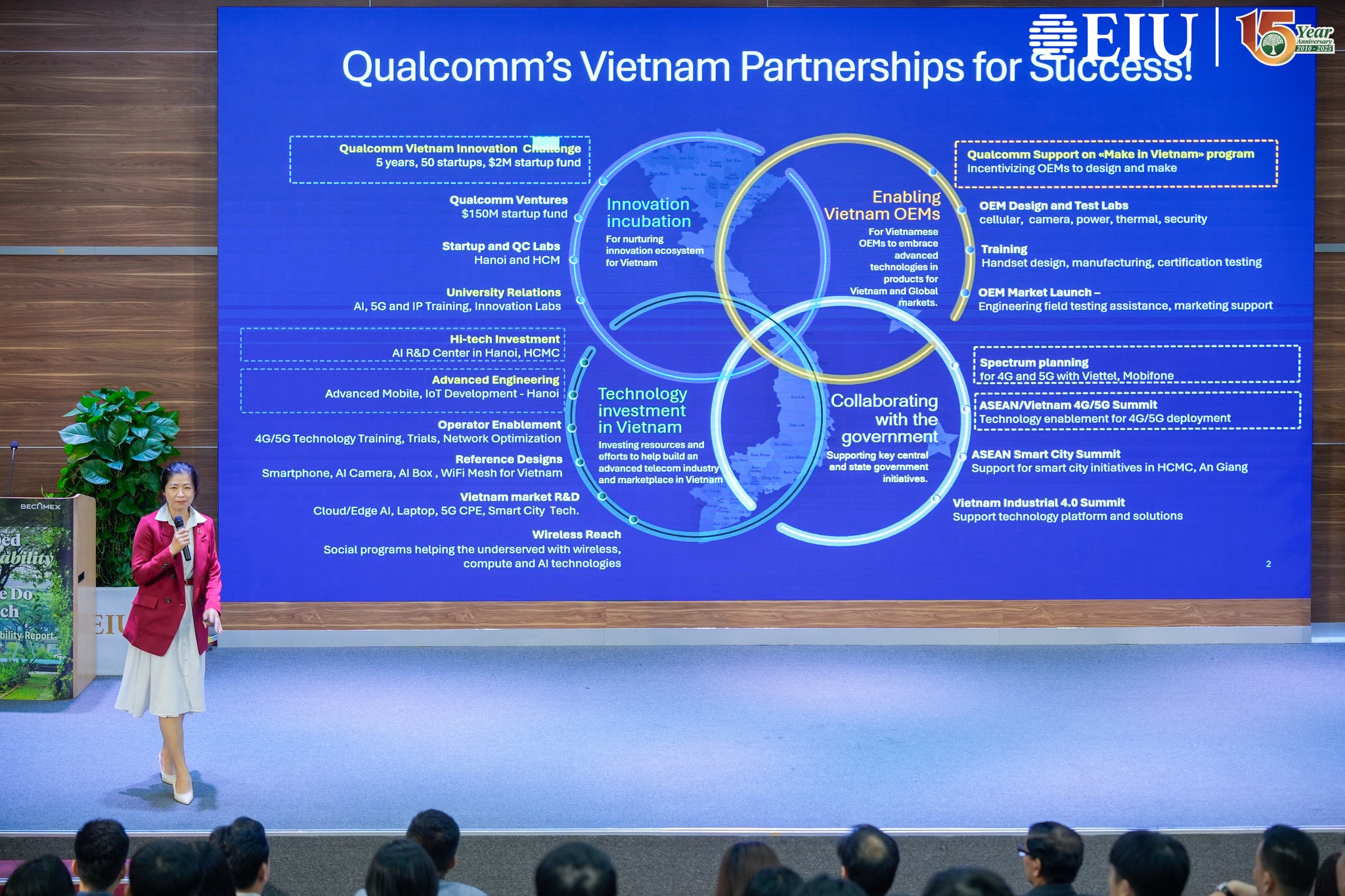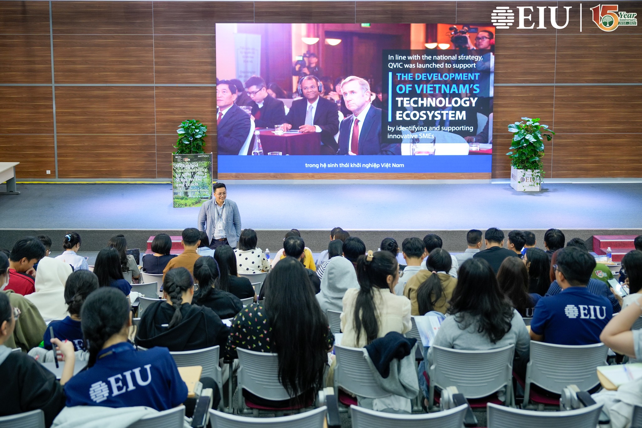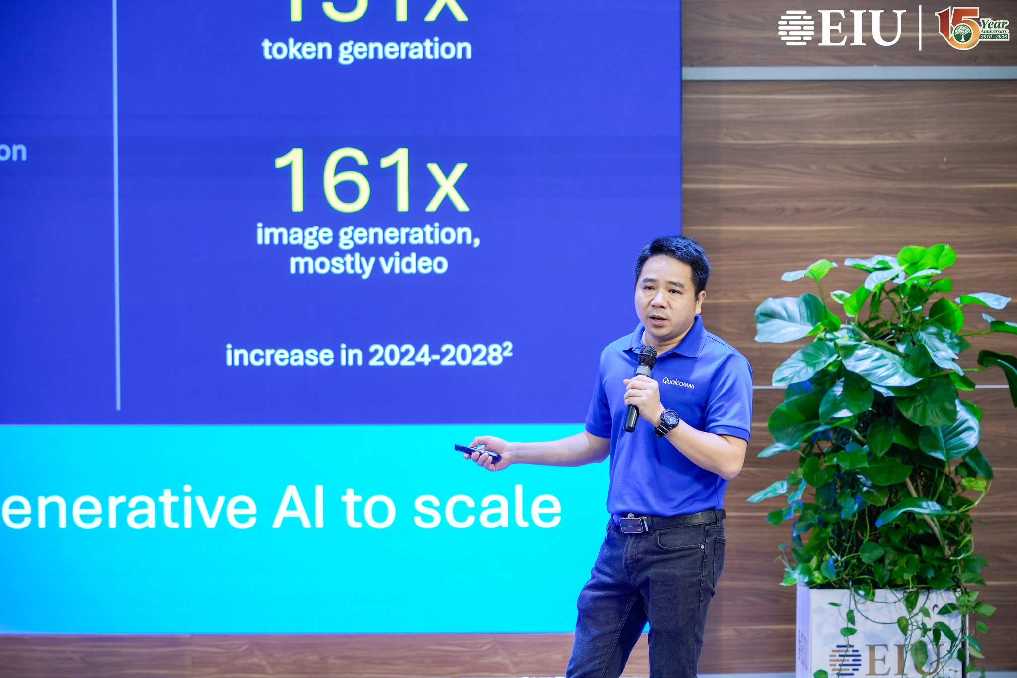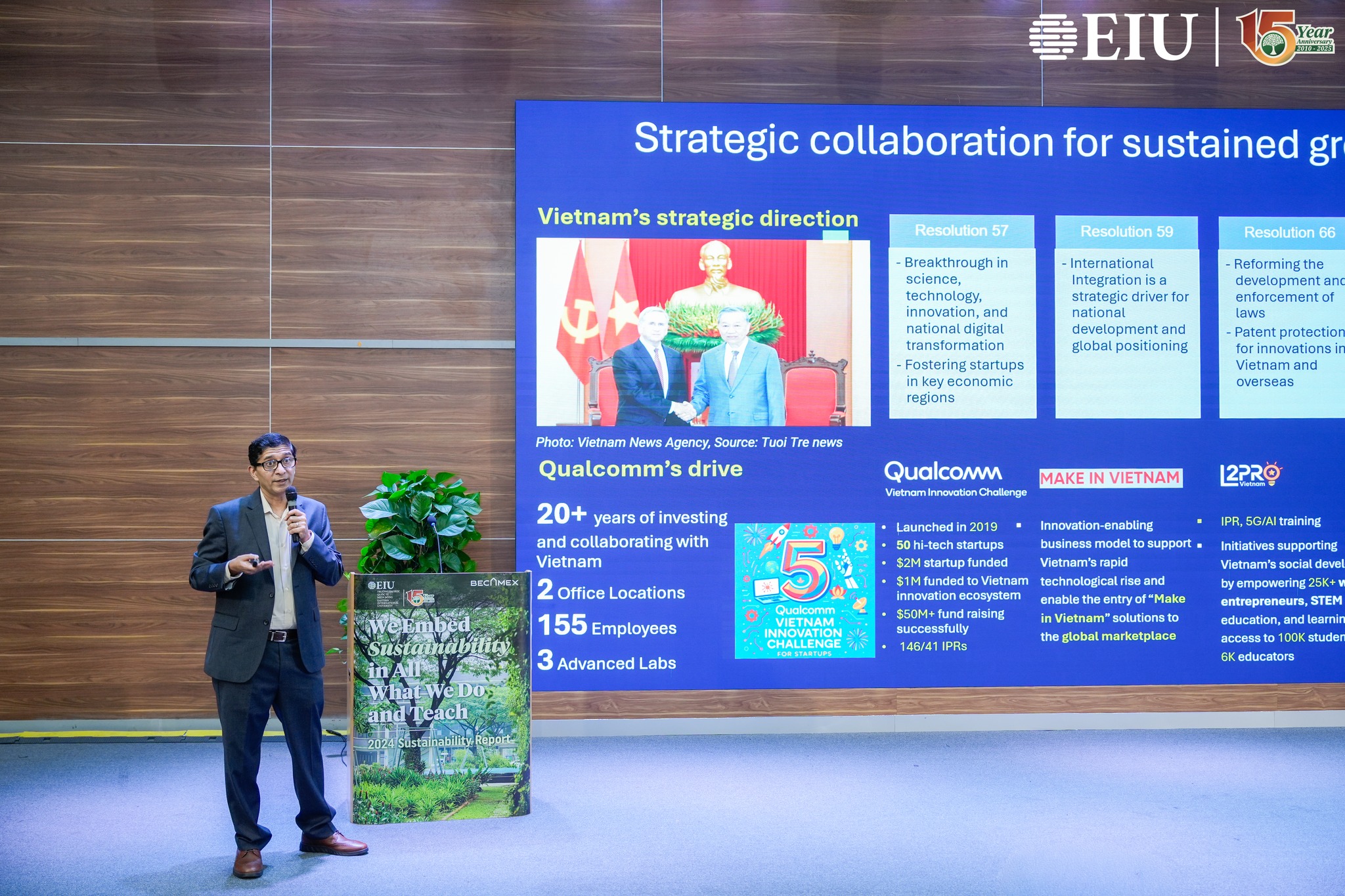 Tại chương trình, sinh viên EIU có cơ hội giao lưu và lắng nghe những chia sẻ sâu sắc từ các chuyên gia của Tập đoàn Qualcomm. Ông Ram Krishnan, Giám đốc Cấp cao mảng Bản quyền công nghệ, mở đầu với hành trình hơn 40 năm đổi mới của Qualcomm – từ những bước đầu trong kết nối di động đến kỷ nguyên 5G, AI và công nghệ Edge, đồng thời nhấn mạnh sở hữu trí tuệ là nền tảng thúc đẩy sáng tạo và phát triển công nghệ toàn cầu. Bên cạnh đó, bà Nguyễn Thanh Thảo, Giám đốc Phát triển Kinh doanh kiêm Đại diện QVIC Việt Nam, chia sẻ về chương trình Qualcomm Vietnam Innovation Challenge (QVIC) – sáng kiến của Qualcomm nhằm thúc đẩy hệ sinh thái đổi mới sáng tạo tại Việt Nam thông qua việc hỗ trợ kỹ thuật, đào tạo và tư vấn về sở hữu trí tuệ cho các startup công nghệ. Bà nhấn mạnh, QVIC không chỉ giúp các doanh nghiệp khởi nghiệp hoàn thiện sản phẩm và mở rộng cơ hội tiếp cận thị trường, mà còn góp phần xây dựng nền tảng tri thức về đổi mới sáng tạo và sở hữu trí tuệ, tạo động lực cho Việt Nam phát triển thành nền kinh tế dựa trên sáng tạo. Đồng thời, ông Lê Văn Khanh, Kỹ sư Công nghệ Qualcomm Việt Nam, mang đến góc nhìn tiên phong về Edge AI, xu hướng trí tuệ nhân tạo được xử lý trực tiếp trên thiết bị, giúp tối ưu hiệu năng, tăng cường bảo mật và mở ra nhiều ứng dụng thực tiễn trong nông nghiệp, logistics và thành phố thông minh.