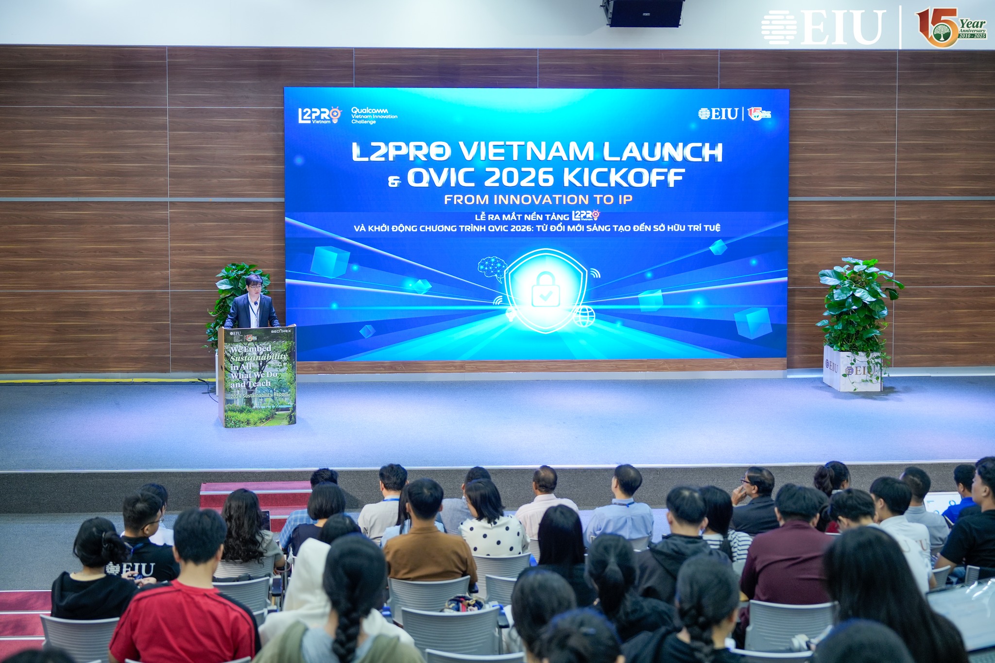 Tại chương trình, sinh viên EIU có cơ hội giao lưu và lắng nghe những chia sẻ sâu sắc từ các chuyên gia của Tập đoàn Qualcomm về hành trình hơn 40 năm đổi mới của Qualcomm, vai trò của sở hữu trí tuệ trong việc thúc đẩy sáng tạo và phát triển công nghệ toàn cầu; cùng những xu hướng mới như chương trình Qualcomm Vietnam Innovation Challenge (QVIC) – sáng kiến của Qualcomm nhằm hỗ trợ kỹ thuật, đào tạo và tư vấn về sở hữu trí tuệ cho các startup công nghệ. Bên cạnh đó, các bạn cũng được tiếp cận về Edge AI, xu hướng trí tuệ nhân tạo được xử lý trực tiếp trên thiết bị, giúp tối ưu hiệu năng, tăng cường bảo mật và mở ra nhiều ứng dụng thực tiễn trong nông nghiệp, logistics và thành phố thông minh. Đồng thời, nhiều sinh viên cũng đăng ký trở thành học viên của nền tảng L2Pro Việt Nam để trang bị kiến thức về sở hữu trí tuệ và chuẩn bị hành trang cho hành trình sáng tạo trong tương lai.